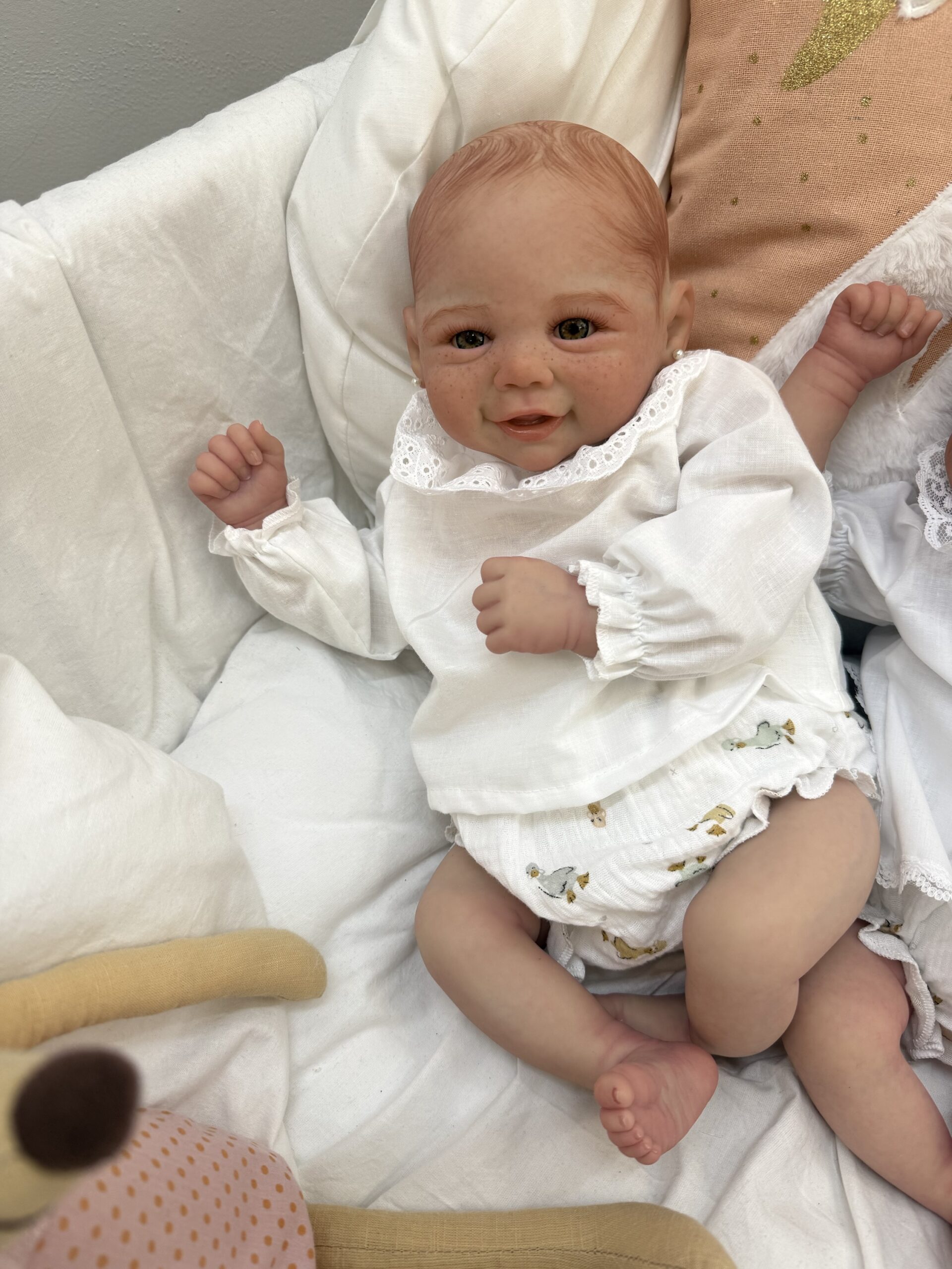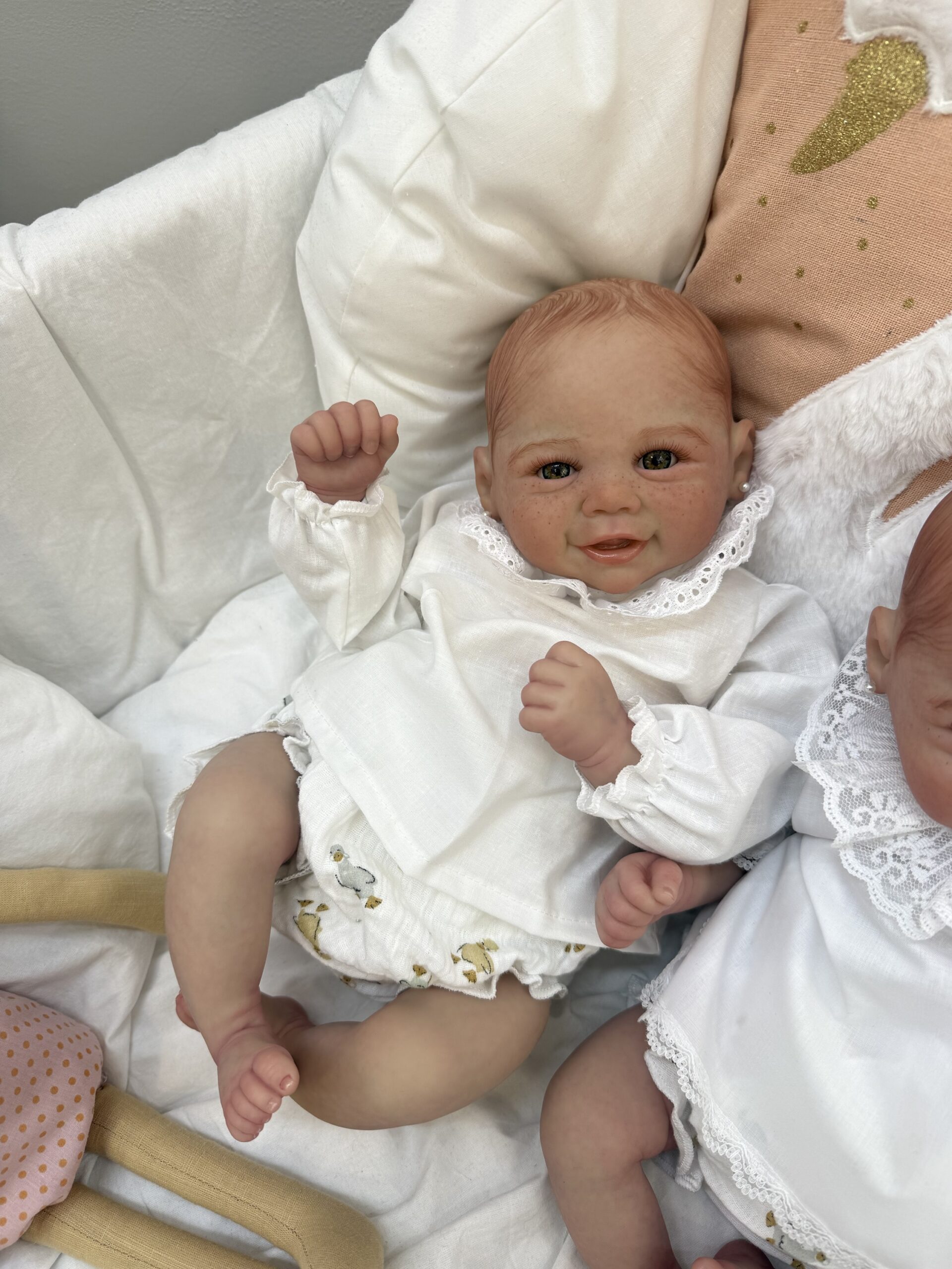 Su cabecita se ladea, y adapta la postura natural de un bebé, su cuerpo está relleno, los ojitos son de cristal, pestañas injertadas, venitas, rojeces, efecto piel, textura piel etc…